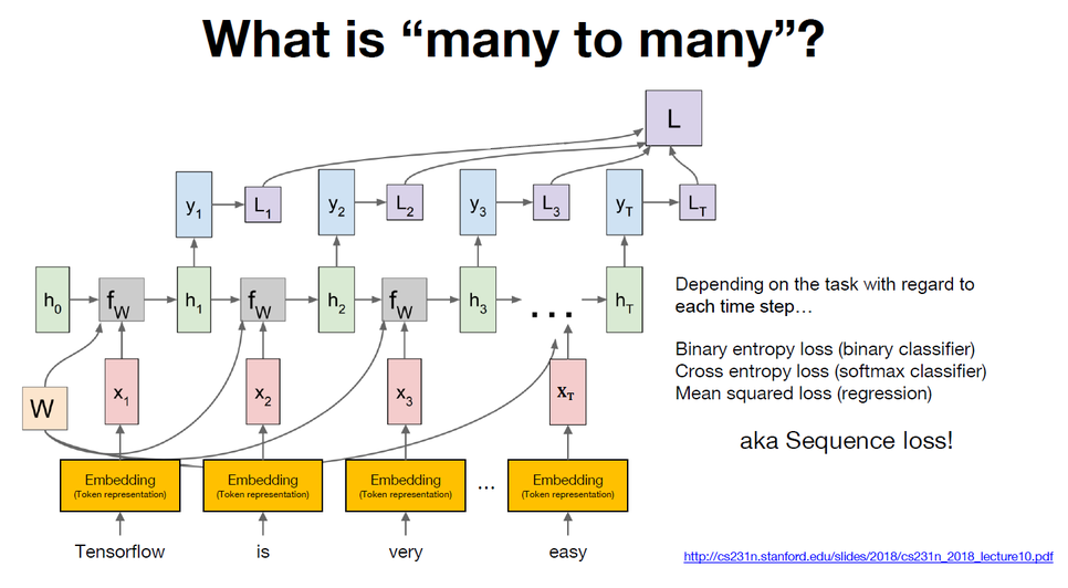 이전과 마찬가지로 token 자체를 RNN이 처리할 수 없으므로 Embedding layer를 통해 RNN이 처리할 수 있도록 numeric vector로 전처리를 한다 (이전 예제에서는 토큰을 one hot vector로 변환했었다). numeric vector로 변환된 토큰을 RNN이 각각의 토큰을 순서대로 읽을 때마다 토큰에 대한 출력을 내고 이를 정답과 비교하여 토큰마다 loss를 계산하여 그 토큰들의 loss의 평균을 계산한다. 이를 sequence loss라고 한다. 그리고 이 sequence loss로 RNN을 back propagation을 통해서 학습할 수 있다. 이전 예제와 달리 loss 계산이 복잡해지는 것 외에는 거의 동일하다고 볼 수 있다.