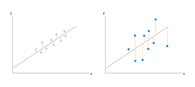 위 그림의 왼쪽이 "예측이 거의 맞는" 상태이고, 오른쪽이 "거의 맞지 않는" 상태라는 것을 알 수 있다. 이러한 두 가지 경우를 비교하기 위해서는 "예측이 어느정도 맞고 있는가"를 객관적으로 표시하는 지표가 결정지표이다. 결정계수는 0부터 1사이의 범위 값으로, 앞서 말했듯이 1에 가까울수록 좋은 결과가 된다. 이 숫자는 밀접히는 "회귀분석한 결과가 목적변수의 분산을 어느정도 설명하고 있는가"에 의해 정의되고 있다.
