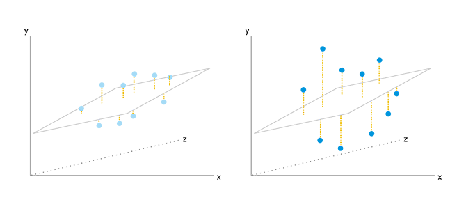 2차원이었던 단일 회귀분석과 달리 3차원의 공간에 점이 허공에 뜬 상태가 되지만, 기본적인 결정계수와는 동일하다. 이 경우세도 "(이 그림의 경우는) x와 z로부터 구해진 y의 예측값이 실제의 y과 어느정도 일치하고 있는가"를 표시하고 있는 것이 결정계수이다. 아까의 2차원의 회귀 분석의 경우와 동일하게 오차가 적으면 적을수록 좋은 결과가 된다.
