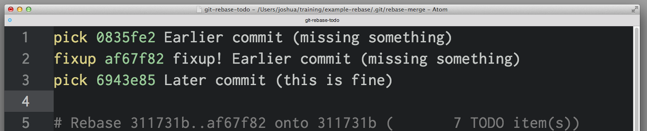 git commit --squash는 squash! 전의 커밋과 같이 커밋 메시지를 붙인 새로운 커밋을 만든다(commit --squash를 사용하면 타이핑의 수고가 줄어든다). 정리된 커밋에 새로운 커밋 메세지를 작성하는 프롬프터가 나와도 괜찮다면, git commit --fixup를 사용하는 것이 가능하다.