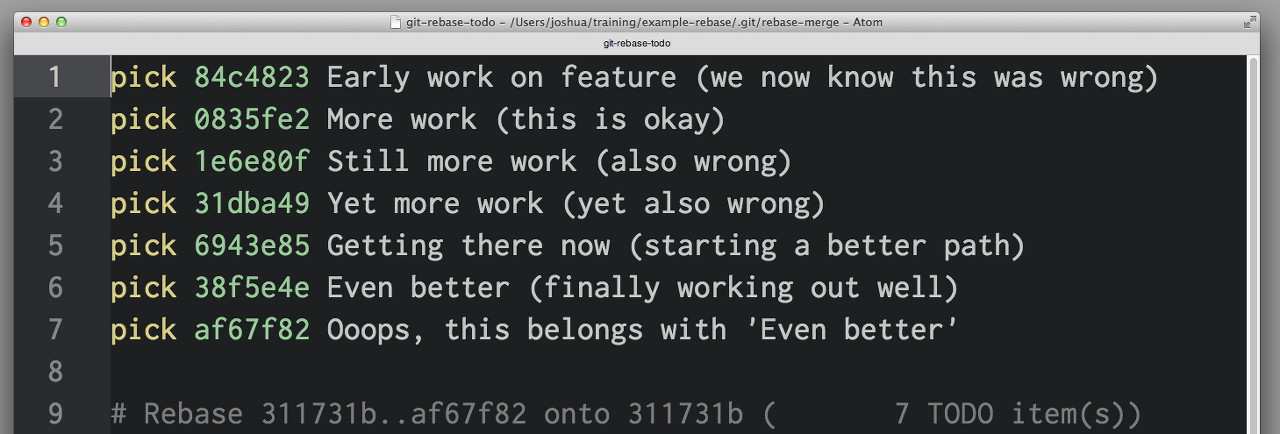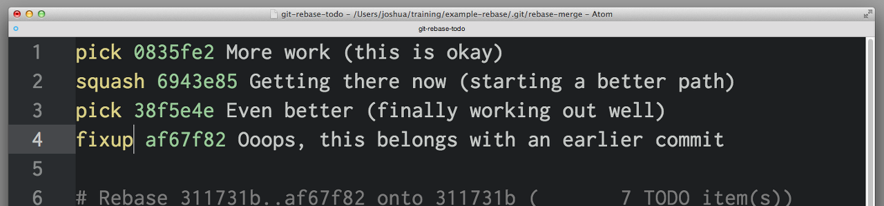 squash와 fixup은 "위"의 커밋으로 묶여진다. squash를 선턱하면, Git은 새롭게 정리된 커밋에 대해 새로운 커밋 메시지를 입력할 수 있게 된다. 한편 fixme를 선택하면, 리스트의 맨 처음의 커밋 메시지가 새로운 커밋 메시지로 바뀐다.