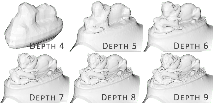 - 깊이는 어느정도로 하면 좋은가? 수목의 깊이는 재구축에 사용된다. 메쉬가 높을 수록 상세하게 된다(기본은 8). 노이즈가 많은 데이터를 사용하면, 생성된 메쉬에 반하는 꼭지점이 유지된지만 알고리즘은 그만큼 탐색하지 않는다. 따라서 최저값(5에서 7의 사이의 값)은 스무싱 효과를 제공하지만, 상세한 표현은 놓치고 만다. 심도값이 높을수록, 생성된 메쉬의 꼭지점의 결과양이 많아진다.
