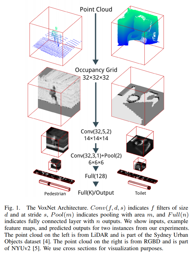 Volumetric CNN이라는 이름의 모델로 point cloud 를 voxel화하여 한층 한층을 이미지로써 다루며 그 이미지는 합성곱 신경망에 입력되게 된다. 각 voxel은 2개의 숫자로 표현되어, 메쉬로부터 voxel로 변환할 때 voxel 안에 데이터가 있는지 아닌지를 0혹은 1의 값으로 결정해 표현한다.