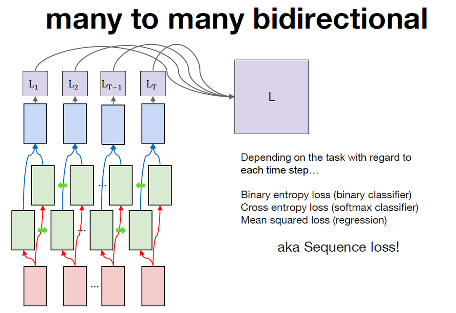 loss를 계산하는 방법은 이전 강의에서 RNN을 many to many방식과 동일하게 sequence loss를 계산한다. ( 각 토큰마다의 bidirectional RNN의 출력과 정답을 비교하여 loss를 계산하고 마스킹을 활용하여 데이터 간의 길이를 맞추기 위한 pad토큰을 제외한 실제 데이터에 유효한 토큰들에 대해서 loss를 계산하고 이를 판별한다. )이렇게 계산된 sequence loss로 bidirectional RNN을 back propagation을 통해서 학습할 수 있다.