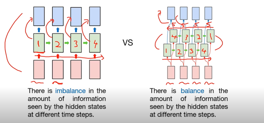 단방향 RNN이 시퀀스의 첫 번째 토큰을 읽었을 때, 첫 번째 토큰에 대한 hidden states에는 정보가 1만큼 저장되어 있다고 하면, 그 정보를 기반으로 첫 번째 아웃풋을 내고, 다시 RNN이 시퀀스의 두 번째 토큰을 읽었을 때는 첫 번째 토큰에 대한 hidden states의 정보도 활용하여 두 번째 아웃풋을 출력하고, 또 다시 RNN이 시퀀스의 세 번째 토큰을 읽었을 때는 첫 번째와 두 번째 토큰에 대한 hidden states의 정보를 활용하여 세 번째 아웃풋을 내는 방식이므로 정보의 불균형이 생길 수 밖에 없는 구조이다.