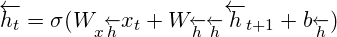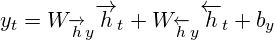 이러한 구조적 문제점을 해결하기 위해 등장한 것이 bidirectional RNN이다. bidirectional RNN은 2개의 Hidden Layer을 가지고 있다. 전방향 상태(Forward States)정보를 가지고 있는 hidden layer와 후방향 상태(Backward States) 정보를 가지고 있는 hidden layer가 있고, 이 둘은 서로 연결되어 있지 않은 구조로 형성되어 있다. 그러나 입력되는 토큰은 이 두 가지 hidden layer에 모두 전달되고 아웃풋 layer은 이 두 가지 hidden layer의 값을 모두 받아서 계산한다. 이를 수식으로 나타내면 아래와 같다.
