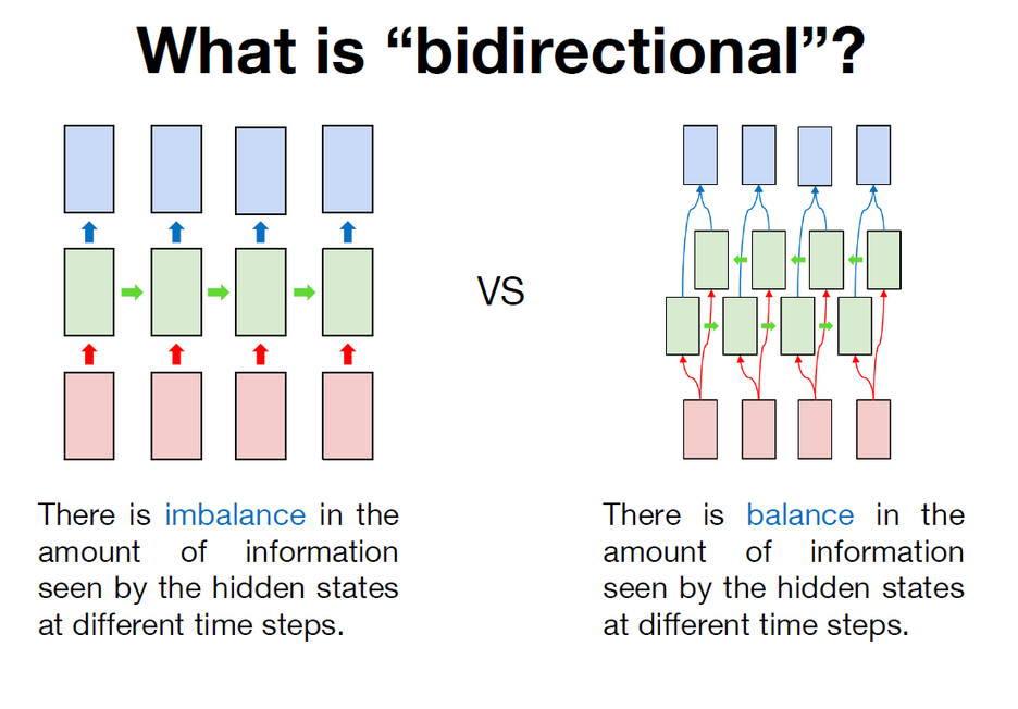 이전 강의까지는 모두 RNN을 모두 단방향으로만 활용을 하였는데, 사실 이 방식은 정보의 불균형이 존재한다. 풀어서 설명하자면 다음과 같다.