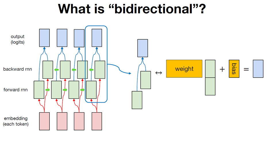 bidirectional RNN의 동작에 대해 조금 더 자세히 살펴보자. 어떠한 시퀀스를 tokenizaiton한 후, embedding layer를 활용하여 각각의 토큰을 numeric vector로 변환한다. (이전 예제들에서는 토큰을 one hot vector로 변환했었다.) 이렇게 변환된 토큰을 forward RNN과 backward RNN이 읽고, 각각의 RNN의 hidden states를 합친다. 정확히는 forward RNN의 hidden states와 backward RNN의 hidden states를 concatenate하는 방식으로 새로운 벡터를 생성하고 그 벡터를 weight와 bias를 활용하여 목적에 맞게 생성, 모델링하는 구조이다. 여기서 weight와 bias는 모든 토큰의 hidden states에 대해 동일하게 적용된다.