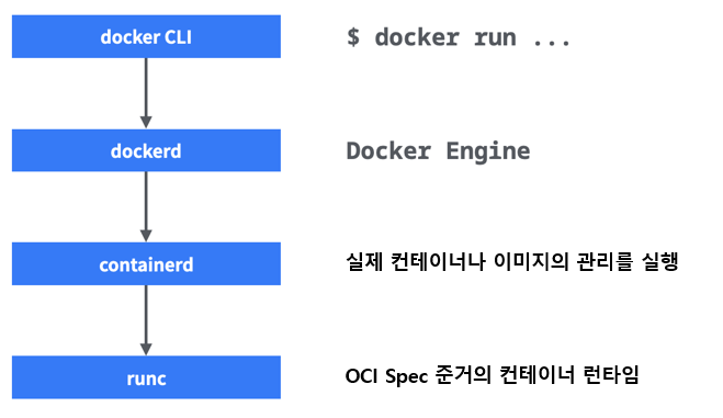 docker run으로 컨테이너를 실행했을 경우, 주로 다음과 같은 컴포넌트가 호출된다. 최종적으로는 컨테이너를 실행하는 런타임이 runc이다. (shim은 생략하고 있다)