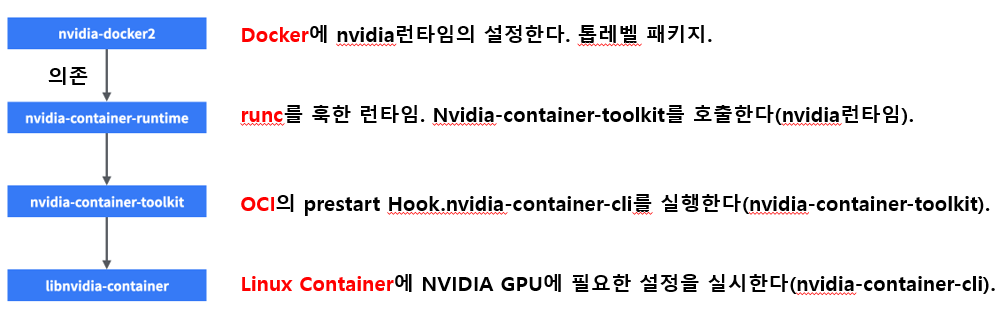 runc를 랩한 OCI 런타임 준거의 nvidia 런타임이 포함되어 있다. Docker에 --runtime=nvidia를 붙인 경우, 이 런타임이 호출된다.