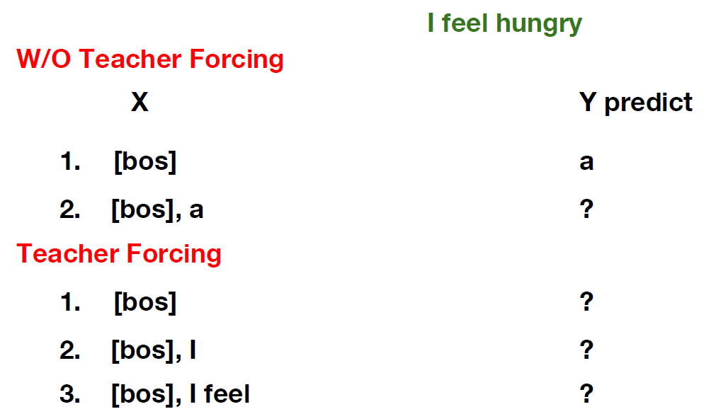 teacher forcing에 대해 간략하게 설명하자면, 예제 데이터 중에 'I feel hungry'라는 문장이 있다. X에 대해서 처음으로 bos, 즉 문장의 시작을 알리는 토큰이 주어졌을 때, 이후 Y의 예측 값 a가 나와있다고 가정해보자. Y의 출력값은 원래대로라면 'I feel hungry'문장의 첫 번째인 'I'가 나와야 정상이지만, bos 토큰 이후에 Y가 잘못 예측한 들어간다고 하면 그 다음 단어를 예측할 땐 이미 전의 예측 자체가 틀렸기 때문에 모델에게 큰 punishment를 제공한다. 이 punishment로 인해 학습이 느려지는 현상이 발생하므로 Y가 무엇을 예측하든지 [bos], I와 [bos], I, feel과 같이 실제 이전 step의 정답 단어들을 입력으로 넣음으로써 예측을 하게 하는 것이 teacher forcing이다.