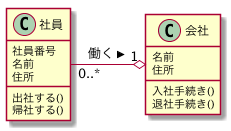 위 그림과 같이 관계명은 ▶를 사용하여 표시한다. 사원은 회사에서 일을 한다는 관계 방향성이 표현됐다. 관계명은 단순히 어떤 관계인가를 표현하는 정도에 불과하다. 지금부터는 다른 클래스를 포함하여, 또 다른 표현 요소에 대해 알아보자.