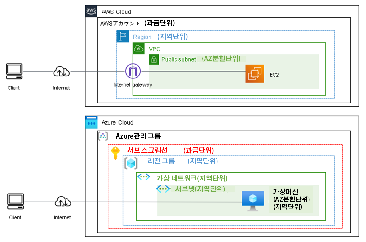 AWS와 Azure 각각에 가상 머신을 1개 실행하여 인터넷에서 부터 접속 할 수 있는 심플한 환경을 만들어 볼 것이다. 이러한 환경을 구축해 가면서 두 개의 차이점에 대해서 간단히 설명하고자한다. 아래의 그림은 AWS와 Azure의 구성도이다. 메모에도 기재해뒀지만, 지역이나 AZ의 설정 단위가 다르다.
