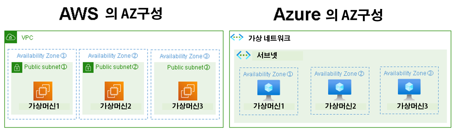 AZ에 대해서는 AWS가 서브넷으로 설정하지만, Azure에서는 가상 머신 단위로 설정한다. Azure에서는 AZ을 가용성존이라고 부른다.