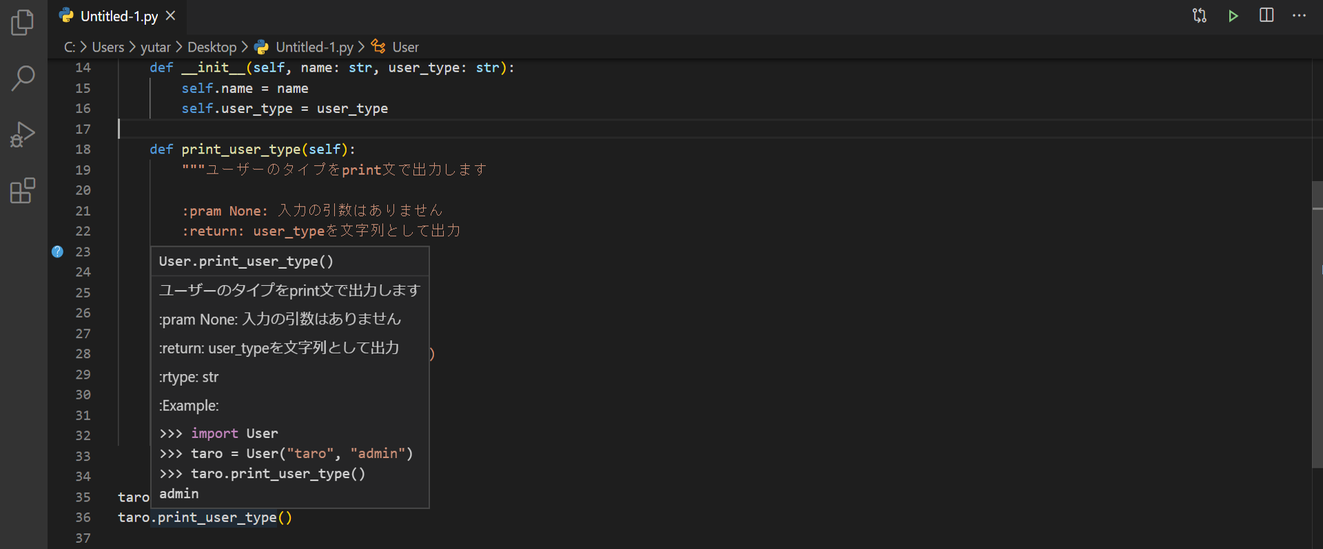User클래스의 user_type은 @property를 정의한다. 그러면 taro = User("taro", "admin"), print(taro.user_type)은 문제실행되어 admin이 출력된다. 그러나, taro.user_type = "normal"하면, @property로 정의한 멤버 변수로 바꾸려고하면 에러가 된다. 이와 같이 외부에서 바꿀 수 없는 변수를 정의할 수 있다.