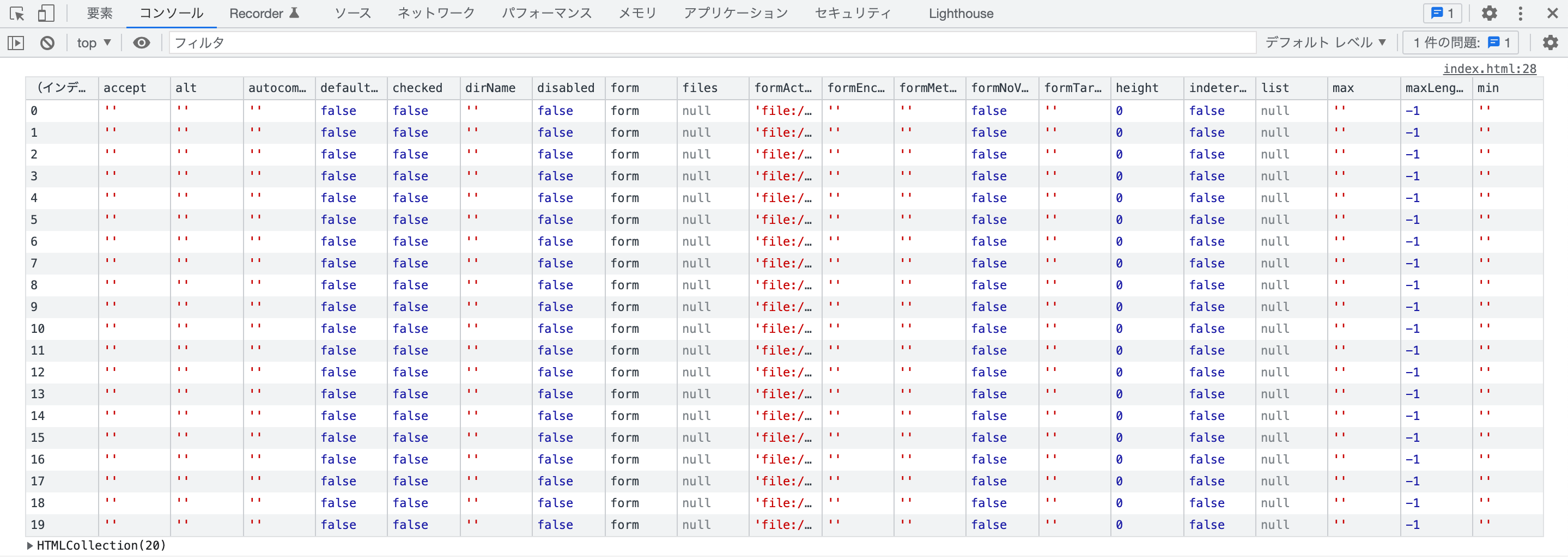 배열, 오브젝트 내용을 표 형식으로 출력해준다. 대량의 input 요소가 있는 상황에서 1개씩 요소를 확인하고 싶은 경우, 예를 들면 다음과 같은 경우.