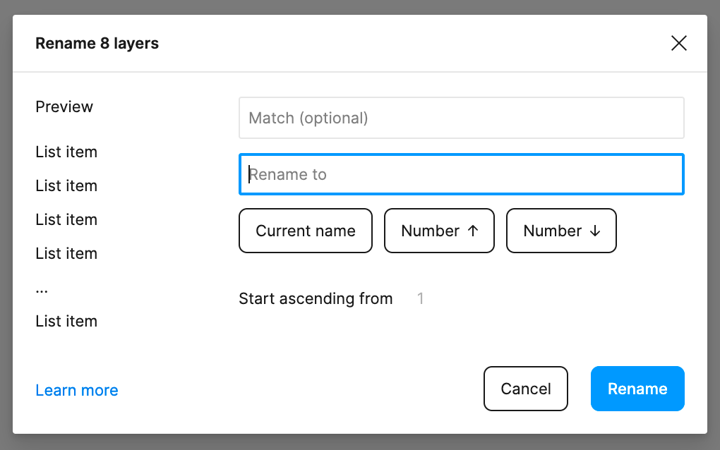 레이어를 여러 개 선택한 상태라면 이름 바꾸기 메뉴의 형태가 열러 인텍스를 추가하거나 텍스트를 변경하거나 텍스트를 추가할 수가 있다.