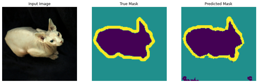 이제 모델을 compile하고 훈련할 일만 남았다. loss는 losses.SparsecCategoricalCrossentropy(from_logits=True)를 사용할 것이다. 그 이유는 이 loss 함수를 사용하는 이유는 multi-class prediction과 같이 네트워크는 각 픽셀에 라벨을 할당하려고 하기 때문이다. the true segmentation mask에서는 각 픽셀은 {0, 1, 2} 중의 값을 가진다. 여기서 네트워크는 세개의 채널을 출력한다. 기본적으로, 각 채널은 클래스 예측을 배우려고하고,losses,SparseCategoricalCrossentropy(from_logits=True)는 이러한 시나리오에 추천되는 loss이다. 그러한 네트워크의 출력을 사용함으로써, 가장 높은 값을 가진 채널의 픽셀에 라벨을 할당한다. 이것이 create_mask 함수가 하는 일이다.