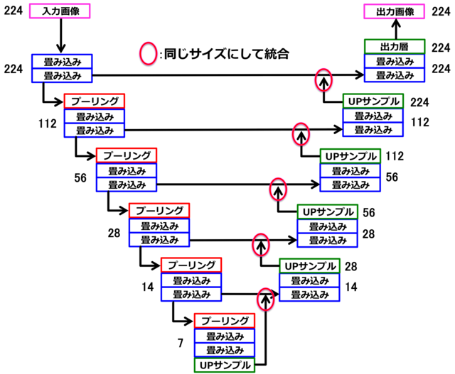 U-Net은 일반적인 CNN과 다른 세 가지 특징이 있다. 그것은 바로 'Upsampling(Upサンプリング)', 'Merge(マージ)', '전체 결합층(FCN)이 존재하지 않는것'이다.