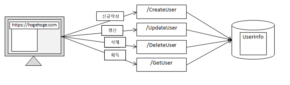 보통 REST한 설계 아이디어로 시스템을 구축하지 않은 사람이라면 아래의 이미지와 같이 처리에 URL이 대응하도록 시스템을 구상할 것이다.