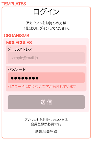 이 페이지의 로그인 폼은 독립하고 있으므로(부모 컴포넌트와 연계가 필요하지 않음 혹은 다른 페이지에 그대로 이식할 수 있는 레벨의 완결된 내용) 로그인 부분은 Organisms으로 나눌 수 있다.