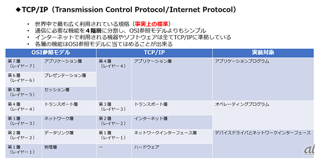 TCP/IP는 'Transmission Control Protocol/Internet Protocol'의 생략이다. 전세계에서 가장 넓게 이용되는 규격으로, 사실상의 표준이 되었다. 통신에 필요한 기능을 4계층으로 분할하여, OSI참조모델보다 단순한 네트워크 아키텍쳐이다. 각 층의 기능을 OSI참조 모델에 적용할 수 있다. 인터넷으로 이용되는 기기나 소프트웨어는 전부 TCP/IP를 준수하고 있다.