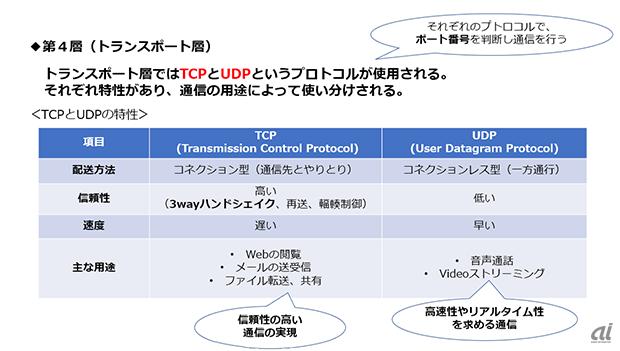 제 4계층인 트렌포트 응은 커넥션을 확립하여 데이터를 확실히 전달 역할을 담당한다. 제 3계층의 네트워크 층부터 흘러 들어온 데이터의 정렬 및 오류 정정 등을 통해 송수신된 데이터의 신뢰성을 보장한다. 트랜포트층에는 'TCP'와 'UTP(User Datagram Protocol)'이라는 프로토콜이 사용된다. 각각의 특성이 있으므로 통신의 용도에 따라 사용법이 갈린다.