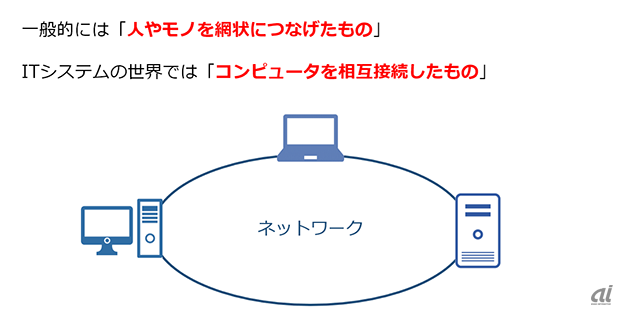 네트워크란 일반적으로 '사람이나 물건을 그물로 엮는 것'이라고 할 수 있다.IT 시스템의 세계에서는 '컴퓨터간 상호접속을 하는 것'을 의미한다. 그리고 '정보가 흐르는 경로'라고 바꿔 불러도 좋을지도 모른다. 통신회로나 케이블 등을 통해서 컴퓨터끼리 접속하는 것으로, 정보의 공유나 처리의 분산, 메신저 교환 등이 가능하다.