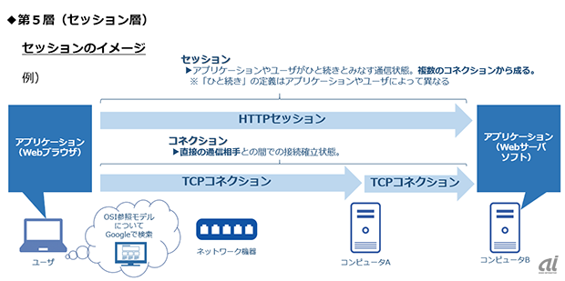 제 5 계층의 세션 계층은 통신의 확립부터 데이터의 전송까지의 통신 일련의 흐름을 관리한다. 세션층은 어플리케이션이나 유저가 하나로 간주하는 통신 상황을 의미하며, 복수의 커넥션으로 구성된다.