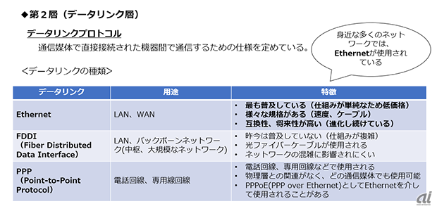 데이터 링크 층의 프로토콜에서는 통신매체에 직접 연결된 기기간의 통신하기 위해 사양을 정하고 있다. 데이터 링크에는 여러 종류가 있지만, 보급되어 있는 것이 'Ethernet'이다. 구조가 단순하고 비용을 줄일 수 있으며, 호환성과 장래성이 가장 높은 것이 특징이다.