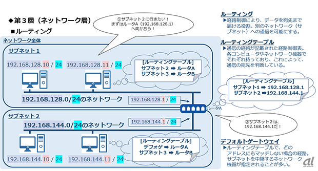 제3계층인 네트워크 층에서는 'IP주소'로부터 수신처와 최적의 루트를 판단하여 송신한다. 네트워크 층에서는 'IP(Internet Protocol)'이나 'ICMP(Internet Control Message Protocol)' 'ARP(Address Resolution Protocol)'등의 프로토콜이 사용된다. 현재 'IPv4' 'IPv6'의 2형태로 존재하고 있으나, 이번 기사에서는 IPv4만 취급한다.