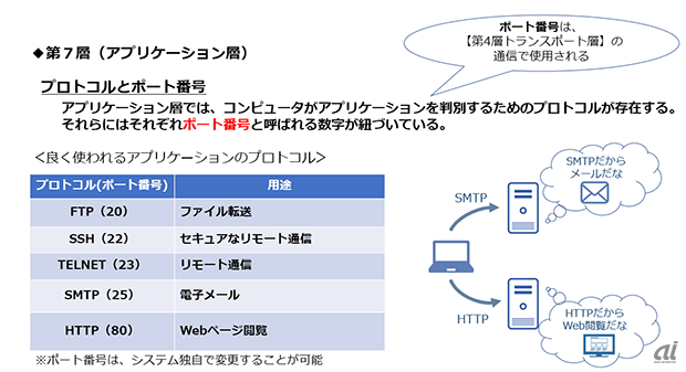제7계층의 응용 프로그램 층은 응용 프로그램에 대해 통신을 위해 필요한 프레젠테이션 계층 아래의 네트워크를 제공한다. 응용 프로그램 층에서는 컴퓨터가 응용 프로그램을 반별하기 위한 프로토콜이 존재하며, 각각은 '포트 번호'라는 숫자와 연결되어 있다. 포트 번호는 시스템 자체로 변경하는 것도 가능하다.