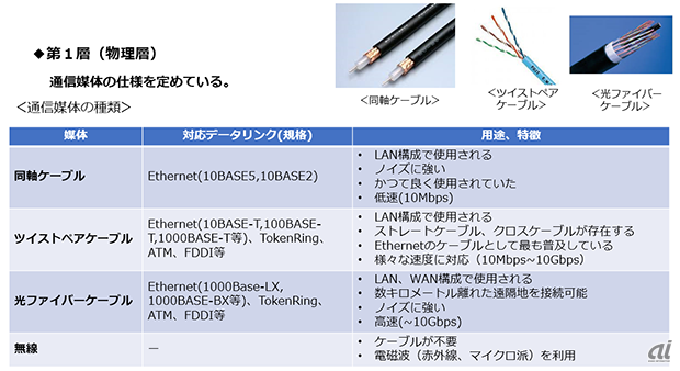 제 1계층인 물리층은 통신매체의 사용을 정해 디지털 디지털 데이터를 전기신호로 교환한다. 통신매체에는 동축케이블, 트위스트 페어 케이블, 광섬유 케이블, 무선 등의 종류가 있다.