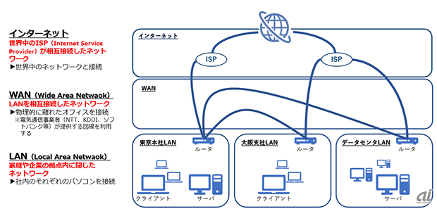 WAN은 'Wide Area Network'의 생략어로, 떨어진 LAN끼리 상호접속하는 네트워크이다. NTT, KDDI, 소프트뱅크 등 전기통신사무업자가 제공하는 회선을 이용하여, 물리적으로 떨어진 기업간의 본사나 지사간의 접속을 할 때 이용된다.
