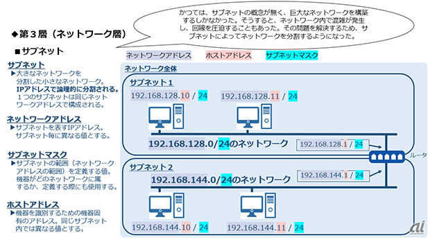 서브넷을 표현하기 위한 값은 '서브넷 마스크'이다. IP주소는 네트워크 주소로서 식별하는 '네트워크 주소부'와 그 네트워크 상의 컴퓨터를 식별하는 '호스트 부분'으로 나눌 수 있다. 하나의 서브넷은 같은 네트워크 주소로 구성되어 있다. 네트워크가 다른 것은 서브넷이 다르다는 것을 의미한다.