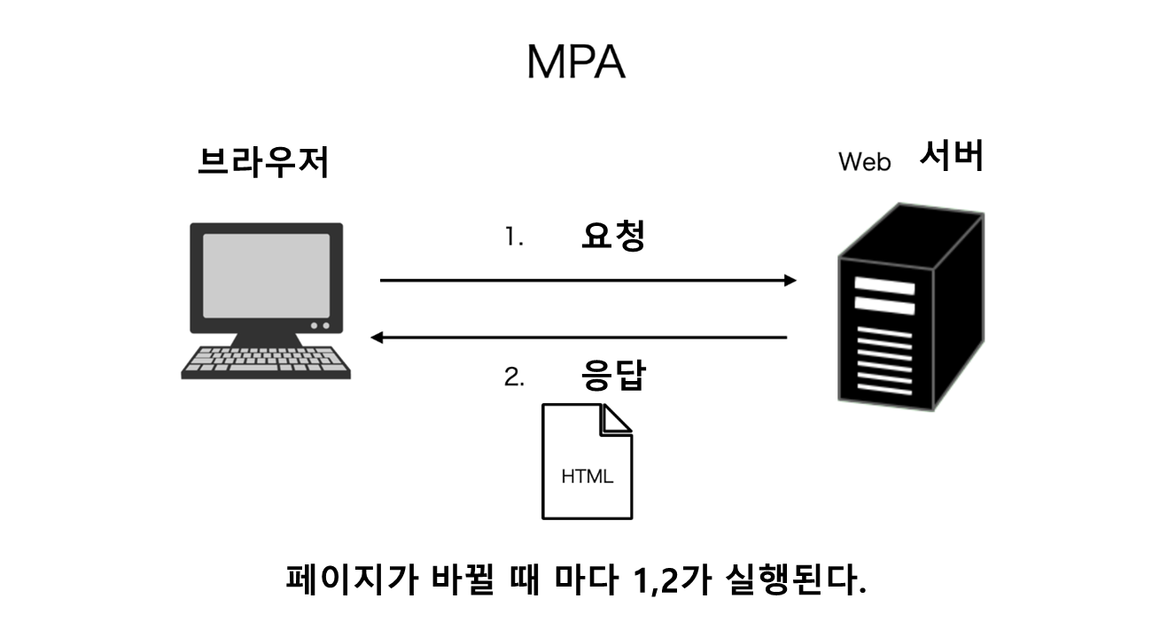 MPA는 Ralis등에 대표되는 백엔드의 프레임워크에만 사용되는 형식으로 이전에는 꽤 자주 채용됐다. 브라우저에서 "이러한 페이지를 원해"라고 HTTP 리퀘스트를 받으면 Web 서버는 내부에서 HTML을 만들어, JavaScript나 CSS를 함께 HTTP 리스폰스로 돌려준다. 중요한 것은 이 처리가 페이지를 이동할 때마다 매번 반복된다는 것이다.