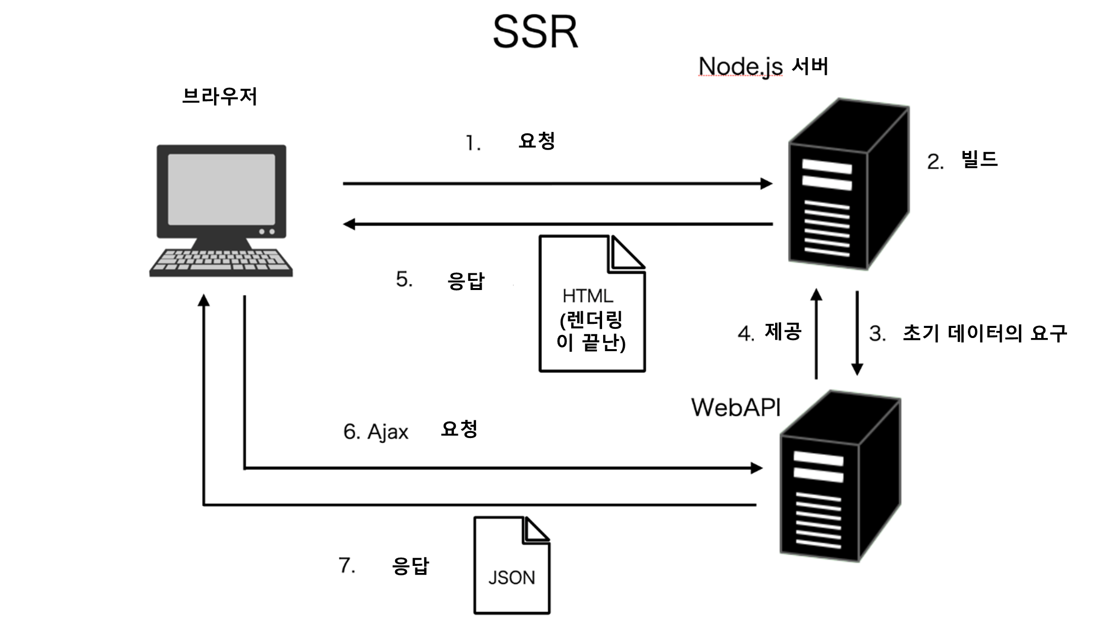 SSR을 간단히 얘기하자면, 페이지 이동 때마다 서버에 리퀘스트가 발생해, 그대로 서버쪽에서 API와ㅣ 연계하여 렌더링하여 생성된 HTML을 브라우저에 전달하는 아키텍처이다.