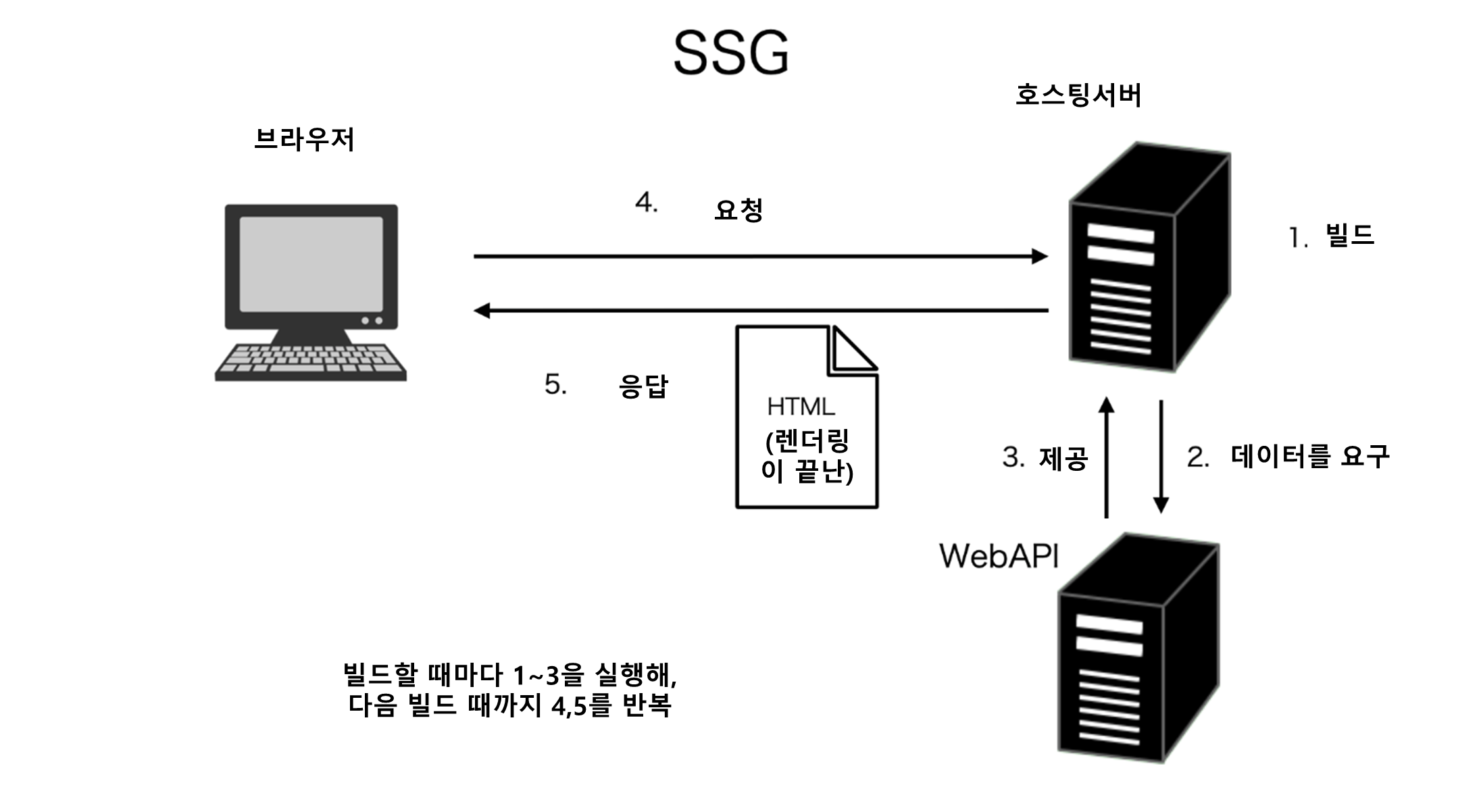 한편으로 SSR과 자주 비교되는 것은 SSG이다. SSG는 빌드시에 서버쪽에서, API부터의 데이터 획득과 그에 따른 HTML의 구축을 끝내 놓고, 유저에게 리퀘스트를 받았을 때에 사전에 준비해둔 HTML을 건내는 아키텍처이다.