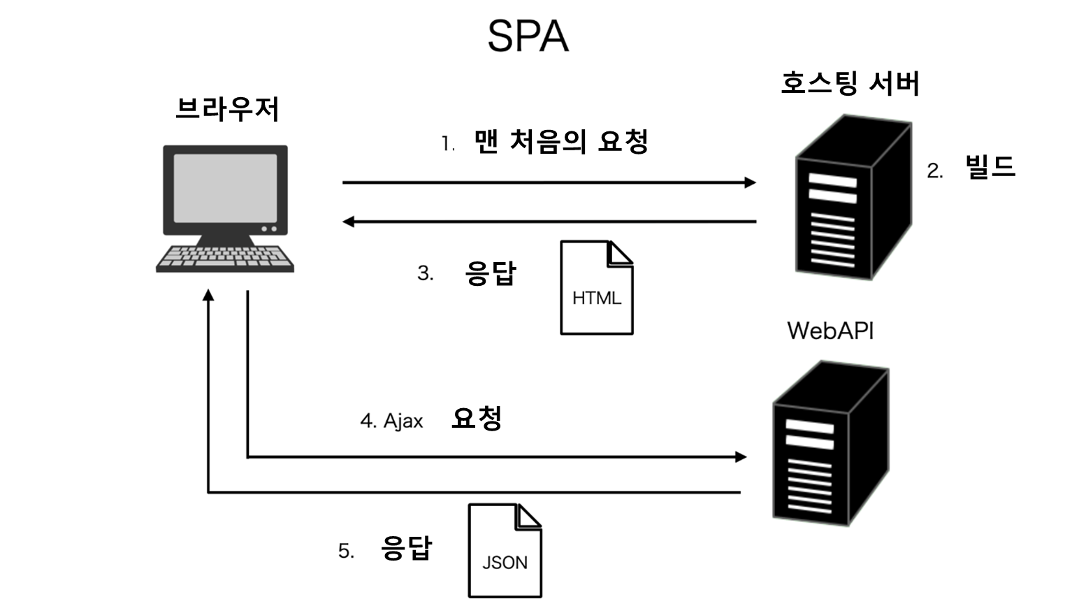SPA의 요지를 간단하게 말하자면, 하나의 페이지에 먼저 호스팅 서버에서 얻은 그 페이지를 기축으로, 표시하고 싶은 것이 있다면 그에 대한 데이터를 매번 API에서 취득하는 아키텍처이다.