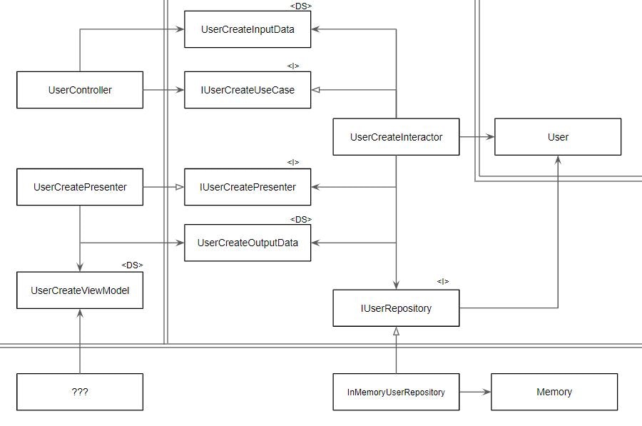 박스 위에 글자가 있는 것이 있는데 <I>는 Interface고, <DS>는 Data Structure(데이터구조체)이다. 대체로 그림대로 재현하고 있지만 유일하게 외부쪽 환경에서 UserCreateViewModel에 의존하는 View가 재현되지 못 했다.