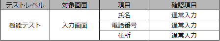 이번 예는 '이름', '전화번호', '주소'의 설계이다. 확인항목은 아래에 작성된 확인 항목에 결합하여 테스트 사양서를 작성하는 형태가 된다. 테스트 사양서는 항목에 맞추어 'O'를 붙인 것만 작성한다.