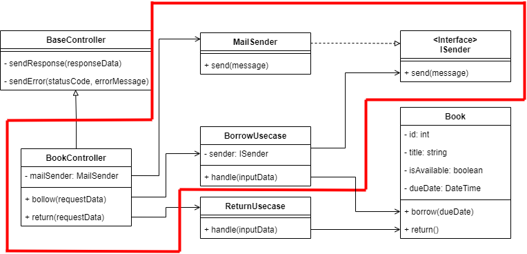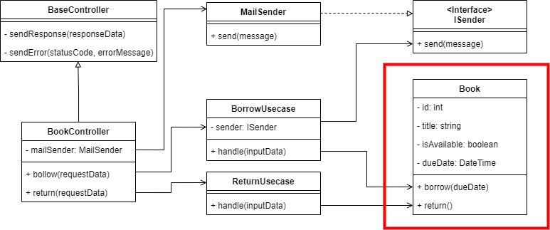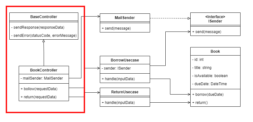BookController에서 BorrowUsecase를 연결하는 실선의 화살표는 의존을 나타낸다. BookController이 BorrowUsecase를 호출하고 있다. 멤버 변수로써 가져지거나, 메소드내에서 인스턴스화하여 사용하거나 하는 경우에 이 화살표를 사용하게 된다.