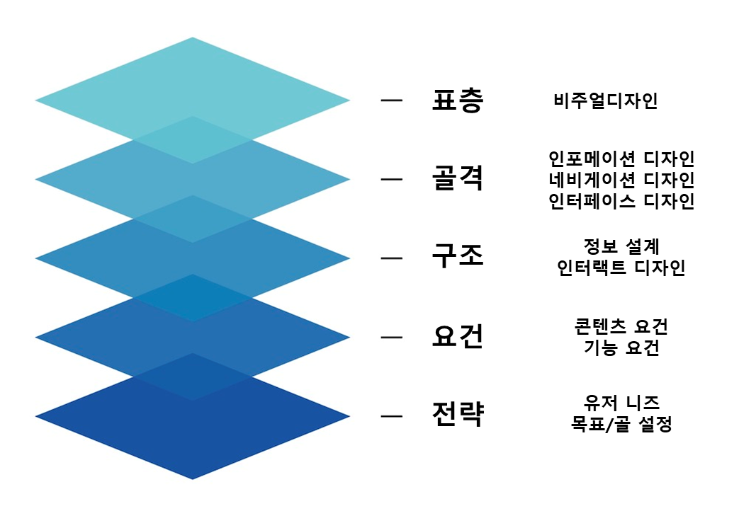 이 그림 자체가 UX의 5단계 모델로, UX는 다음 다섯 가지의 요소로 구성되어 있다.