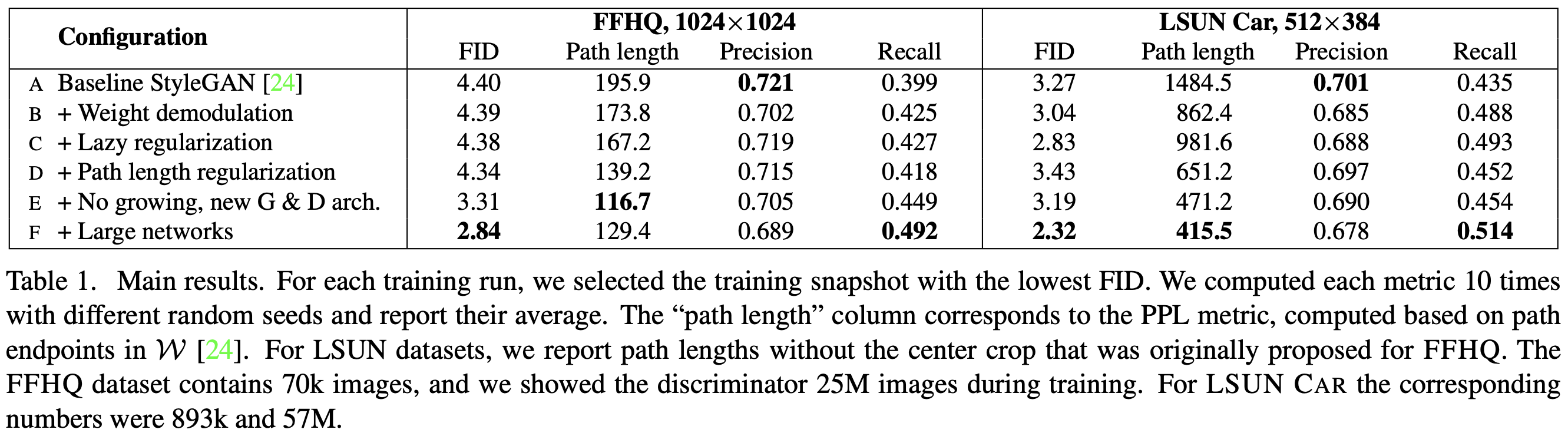 (A) Baseline StyleGAN, (B) AdaIn에서 변화된 정규화의 도입, (C) 잠재공간을 부드럽게 하기 위한 정규화 도입, (E) Progressive Growing 을 사용하지 않은 이미지 생성이다. 각각의 방법이 좋은 기록을 내고 있는 부분이 어디인지 알 수 있을 것이다.