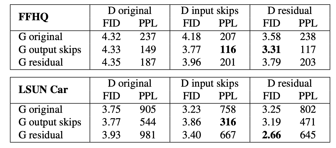 이 결과를 봤을 때, (b)-type의 Generator를 사용하면 Perceptual Path Length가 크게 개선되었고, (c)-type의 Discriminator를 사용하면 FID가 개선되는 방향으로 감을 포착할 수 있다. 학자들에 의해 이 네트워크를 채용되고 있다.