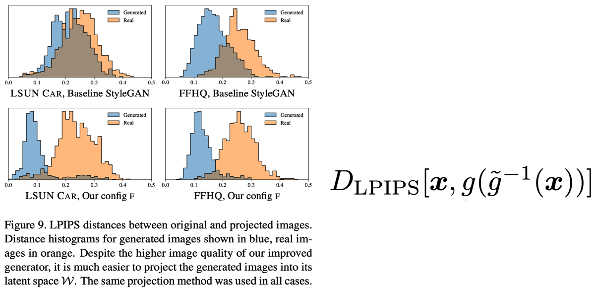 최종적으로 이미지로부터 잠재변수에 떨어 뜨리는 수법으로 분석해본 결과이다. 아래의 히스토그램은 LPIPS거리로, 원본 이미지와 한 번 잠재적 공간에 투영한 후 다시 Generator를 통해 최적의 결과를 생성한 것을 의미하며, 이것을 실제 이미지, StyleGAN, StyleGAN2로 가시화한 결과이다. (실제 이미지도 유사하게 잠재공간으로 떨어뜨리는 것이 가능하다)