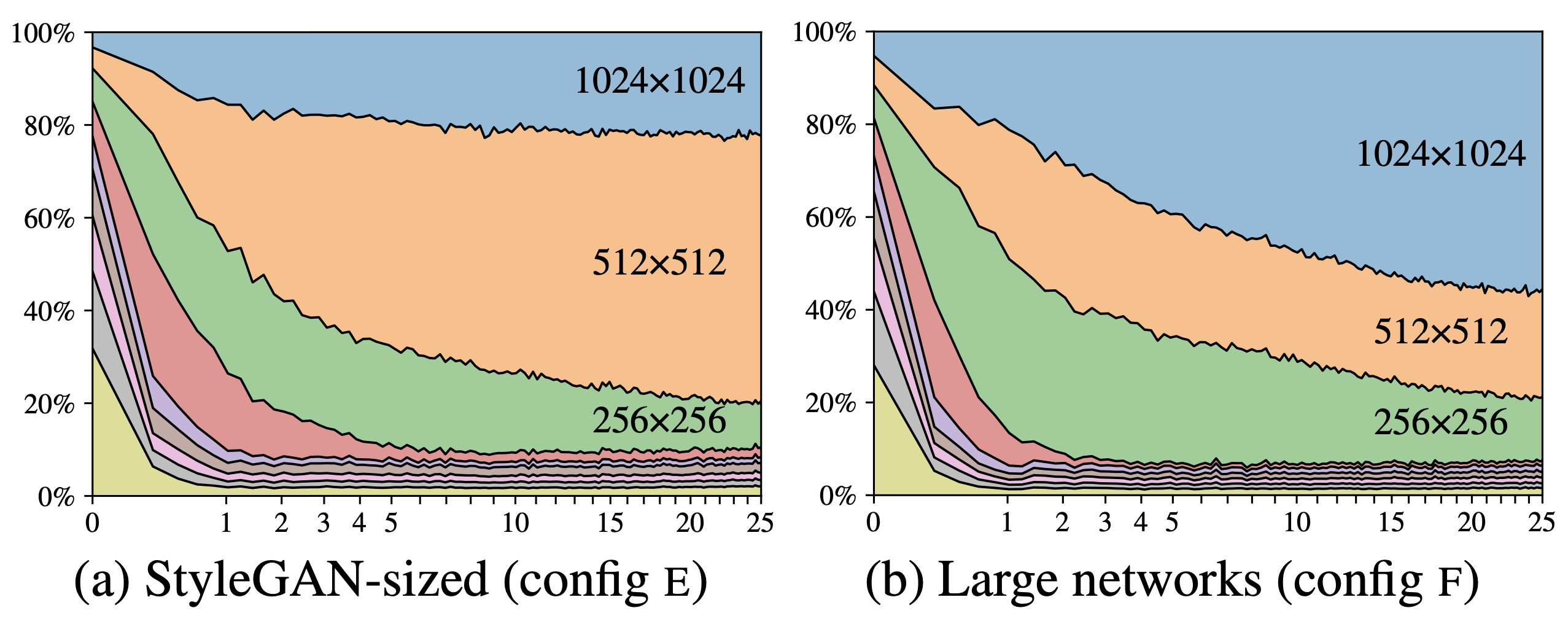 (b)-type의 Generator은 각 해상도의 생성 이미지를 서로 더하기 때문에 최종적으로 생성된 이미지로의 공헌도를 각 해상도마다 산출하는 것이 가능하다. 이런 해상도마다의 공헌도를 세로축, 학습시간을 가로축으로 표시하고 있다. 새로운 네트워크를 채용한 (a)에서는 훈련시간의 경과에 따라 점점 고해상도 쪽의 공헌도가 커지고 있으며, 보다 네트워크사이즈를 크게 한 경우(b)는 학습의 마지막 쪽에서 더 고해상도 쪽의 공헌도가 상승하고 있음을 확인할 수 있다.