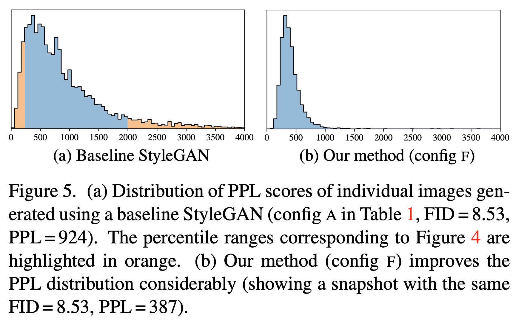 PPL의 분산을 살펴보자. 'PPL이 작다'라는 것은 생성이미지의 질이 좋다는 것이므로 StyleGAN2에서는 이미지의 질이 전반적으로 개선고 있음을 알 수 있다.