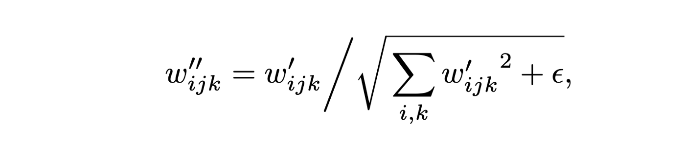 하고 싶은 것은, Convolution한 출력에 표준편자의 역수를 곱하는 조작이다. 그리고 Convolution한 출력에 표준편자의 역수를 곱하는 조작은 가중치 w_ijk에 표준편차의 역수를 곱한 것과 같다. 이러한 설명은 아래의 식으로 표현할 수 있다. (위 그림(d)의 Demod)