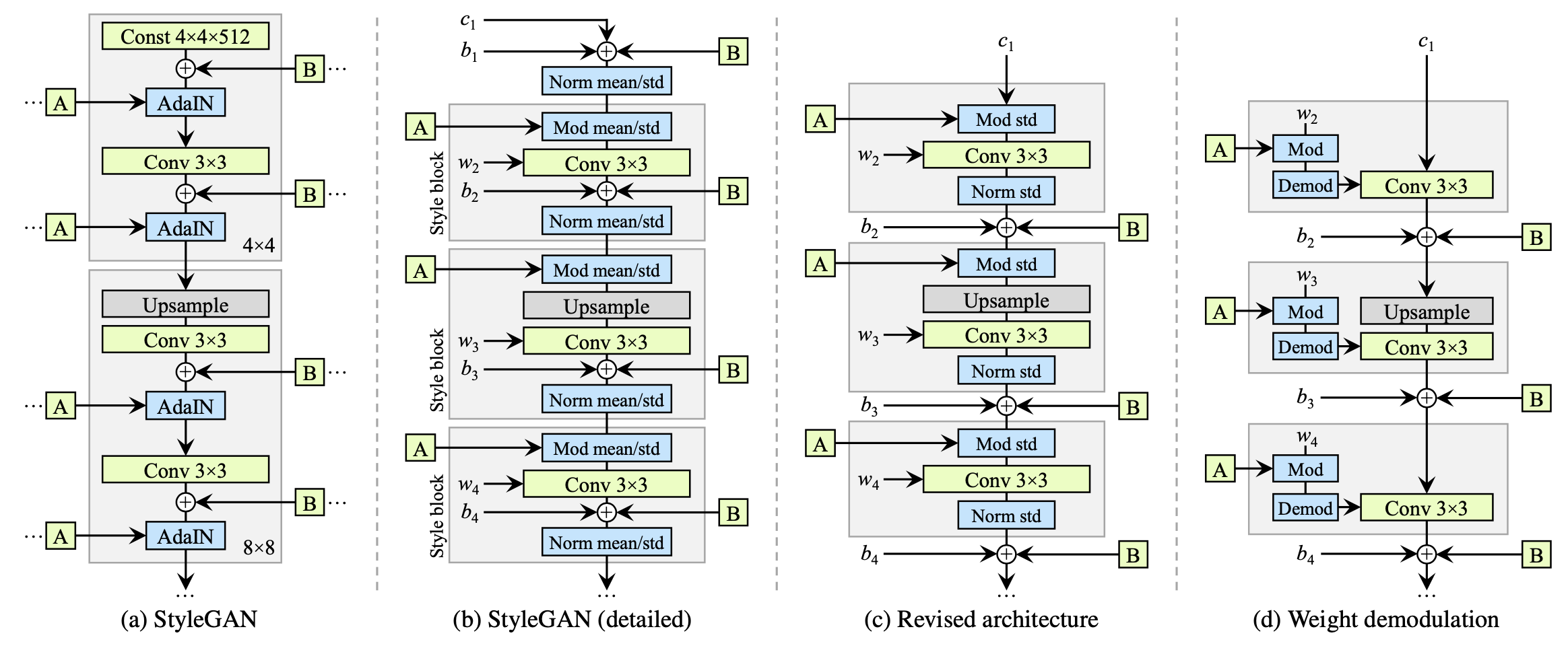 먼저, StyleGAN의 핵심인 Style block(그림 b의 회색 부분)을 단순화하는 것으로 시작한다. AdaIn을 상세히 기술하자면, 두 가지 방법이 있다. 첫 번째 방법은 콘텐츠 정보를 자신의 통계량으로 정규화하는 것, 두 번째 방법은 정규화된 콘텐츠 정보를 스타일의 정보를 이용하여 선형 변환하는 것이다. StyleGAN(a)의 AdaIn부분을 적절하게 확장하면 (b)와 같은 그림이 된다. AdaIn 내부의 조작으로는 콘텐츠의 정규화 → 스타일 벡터에 의한 선형변환으로 이루어지지만, Style block의 중간에서는 스타일 벡터에 의한 선형변환 → (Conv→) → 콘텐츠의 정규화의 순서가 된다는 점을 주의하자.